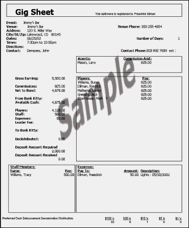Print a hard copy of data for the gig. It provides an easty to read document to show to others and/or keep in a bound file for future reference. May be printed at any time.