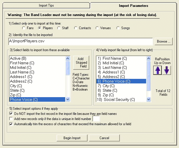 The Band Leader can import data from other systems. It requires that the data be in the format of an ASCII text file with data elements separated by the comma character (commonly known as a comma-delimited file). If your not sure, please email our support department and we'll run you through a couple exercises to determine if you can produce this file on your own. If you can then the Import Service module can be utiliized to define your import file and actually stack your new Band Leader databases. The Import Service module is sold separately.
