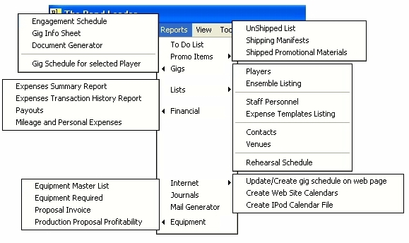 The Document Generator (on the Gigs submenu) allows you to merge data in the system with templates for Contracts, Invoices, and general correspondence that you've created in Microsoft Word, WordPad, or HTML. With the Mail Generator you can create generic or personalized Email messages from scratch, or use templates you've stored in either plain text or HTML. One of the many automatic features of the Mail Generator appends your current engagement schedule to the message.