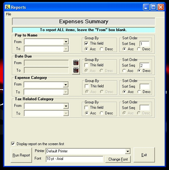 View reports on the screen or print them to paper. Each reports allows the user to choose ranges of data (i.e., dates, categories, names, etc.) and sort the data in many different ways (as shown for the Expenses Summary Report below).